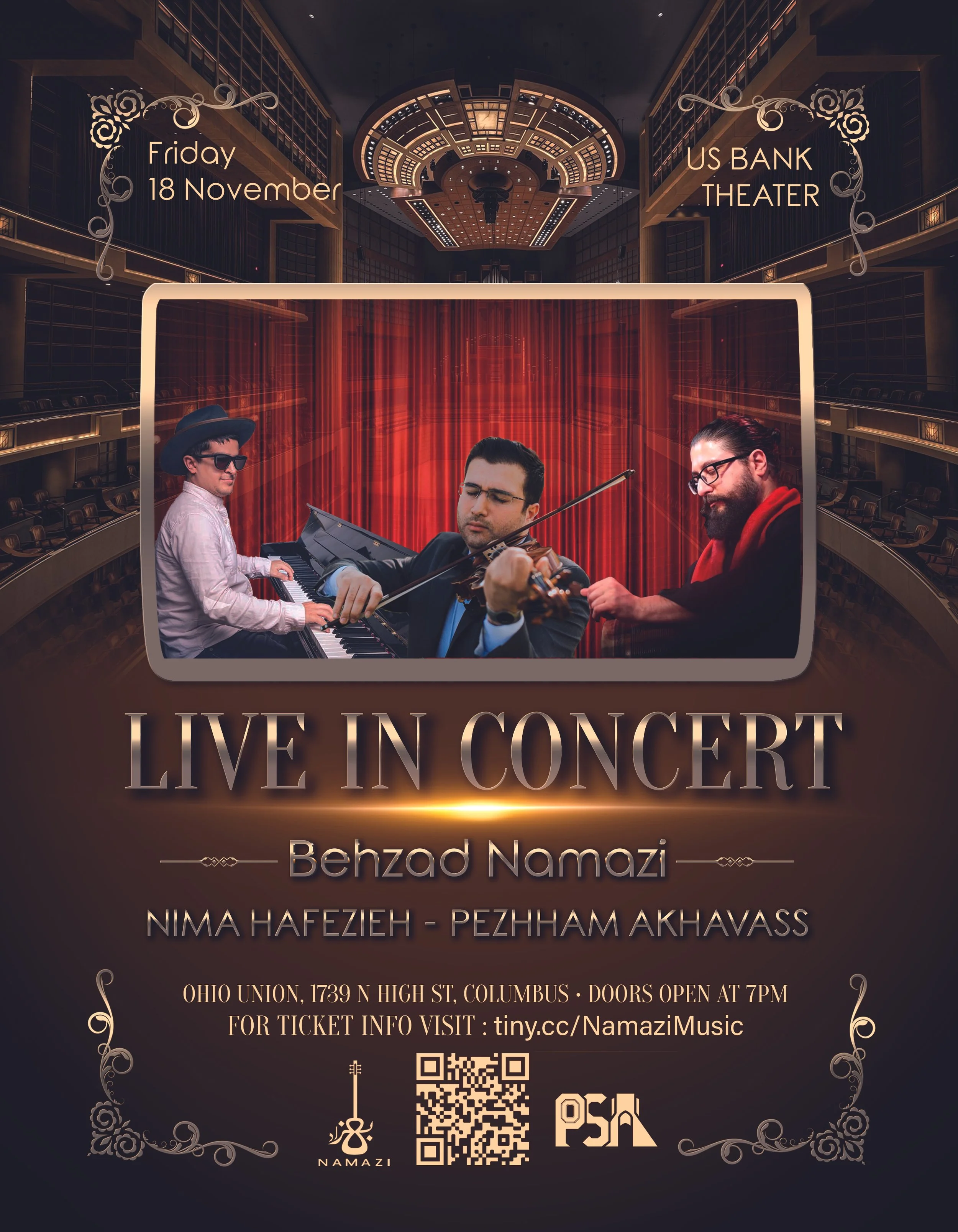 Nov 18 Live in Concert — Behzad Namazi, Pezhham Akhavass & Nima Hafezieh Friday, November 18, 2022 7:00 PM 9:30 PM Google Calendar ICS View Event →